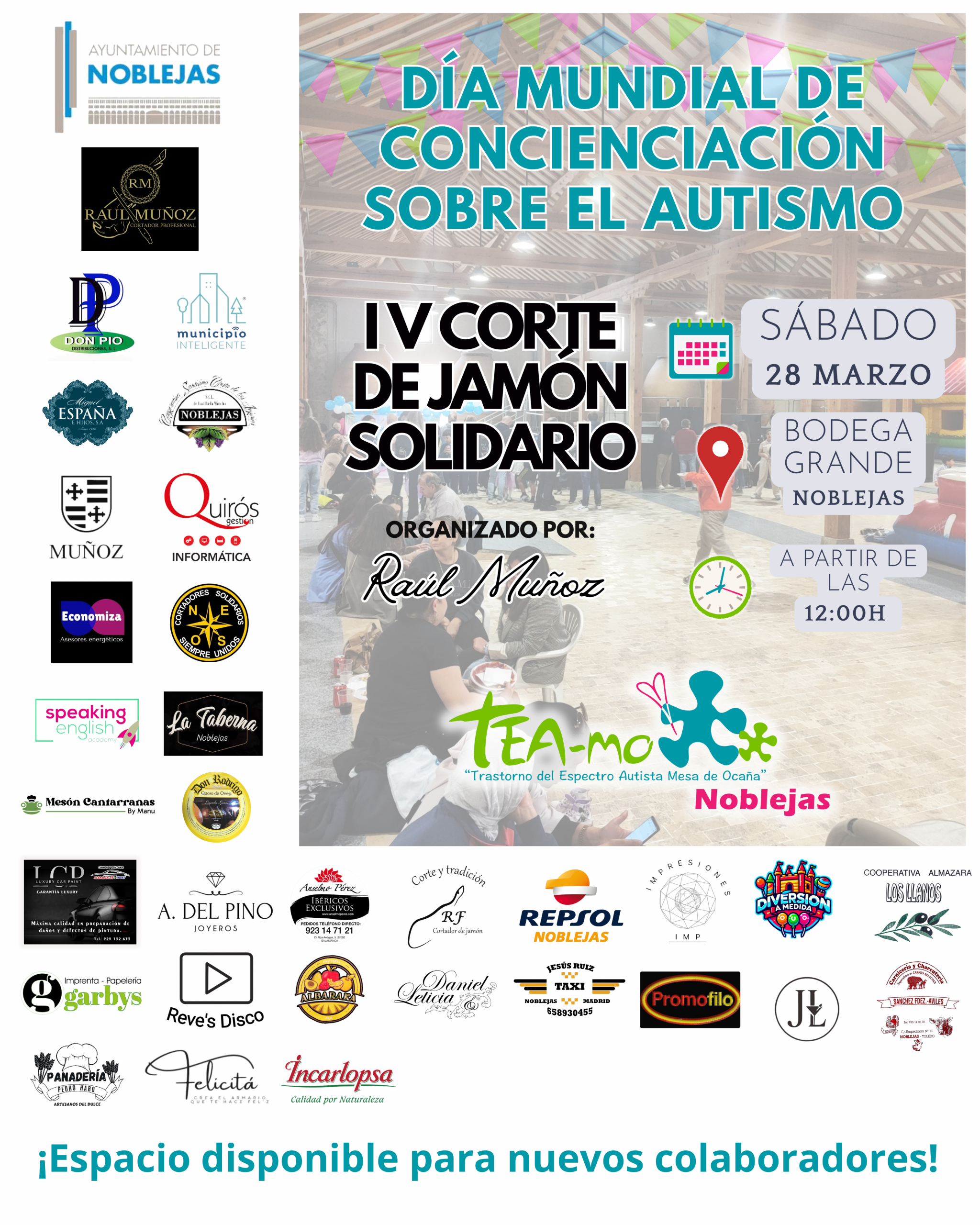 Para celebrar este día tan importante para nuestra asociación, el sábado 28 de marzo llevaremos a cabo el IV CORTE DE JAMÓN SOLIDARIO a partir de las 12:00 horas, en la Bodega Grande de Noblejas (Toledo), donde esperamos repetir el éxito de asistencia de años anteriores.