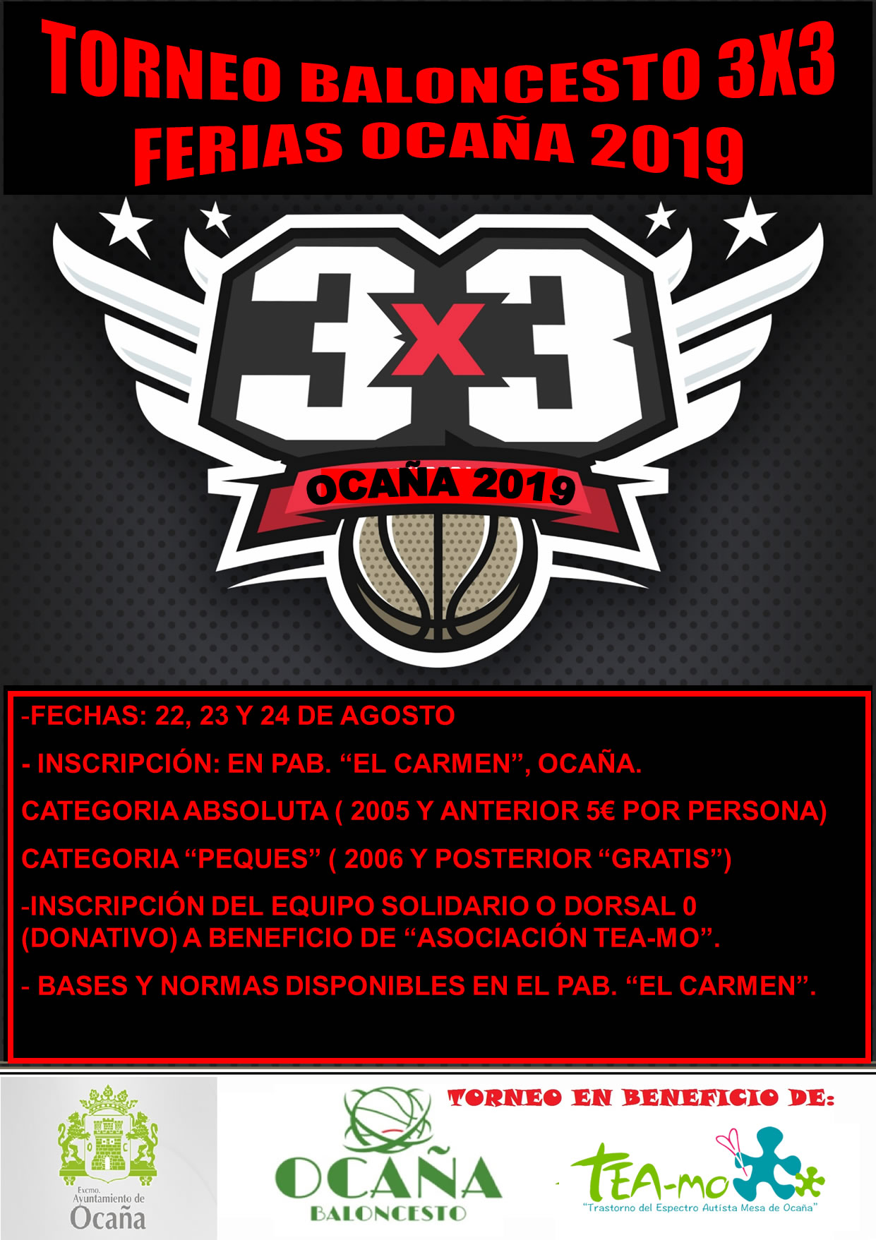Los días 22, 23 y 24 de Agosto, el Club Baloncesto Ocaña organiza el Torneo de Baloncesto 3×3 Ferias Ocaña 2019.